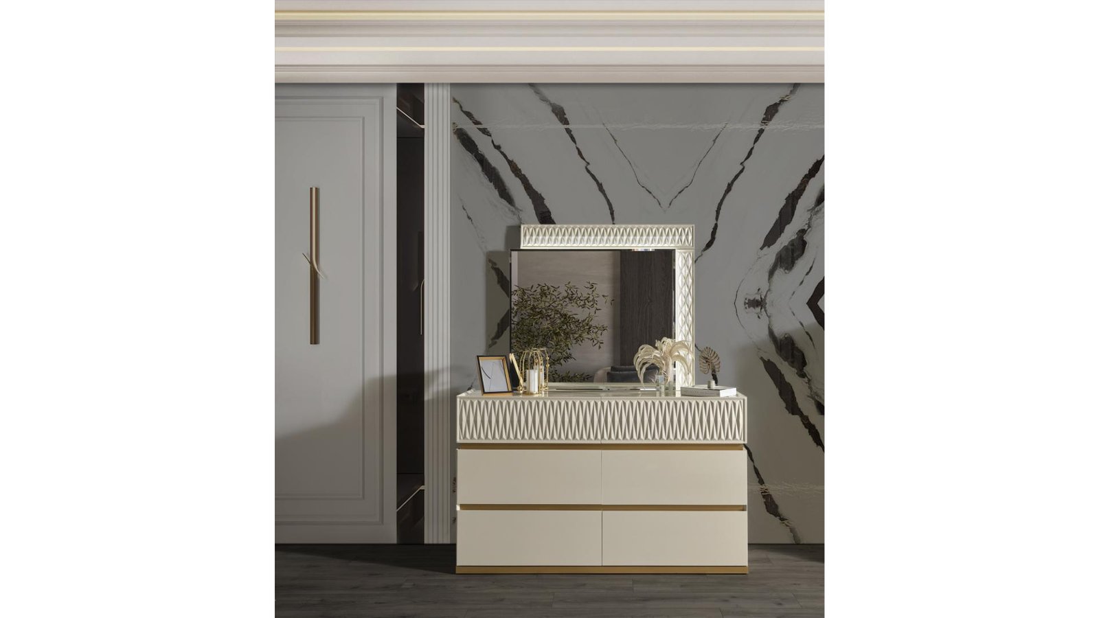 Upgrade your bedroom with this luxurious 5-piece modern bedroom set, designed for both style and functionality. Featuring a sleek gold and cream lacquer finish, this set adds a touch of elegance to any space. The upholstered headboard with LED lighting creates a soft, ambient glow, perfect for relaxation. The geometric design on the case goods adds a unique, contemporary touch, while the soft-close drawers ensure seamless and quiet operation. Crafted from solid and manufactured wood, this set provides durability and a refined aesthetic. Whether you