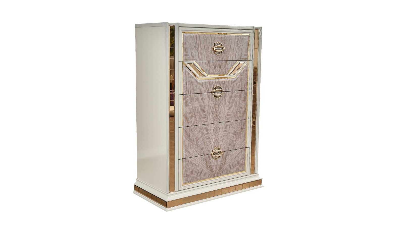 Enhance your bedroom with this elegant and modern bedroom set, designed to bring sophistication and functionality. The bed features a stunning upholstered headboard with integrated LED lighting, framed by gold accents for a luxurious touch. The case goods, including a dresser, mirror, nightstand, and chest, showcase unique textured drawer fronts and gold-finished handles, adding a distinctive charm. Crafted with premium materials, this set offers durability and ample storage, making it a perfect choice for contemporary interiors.