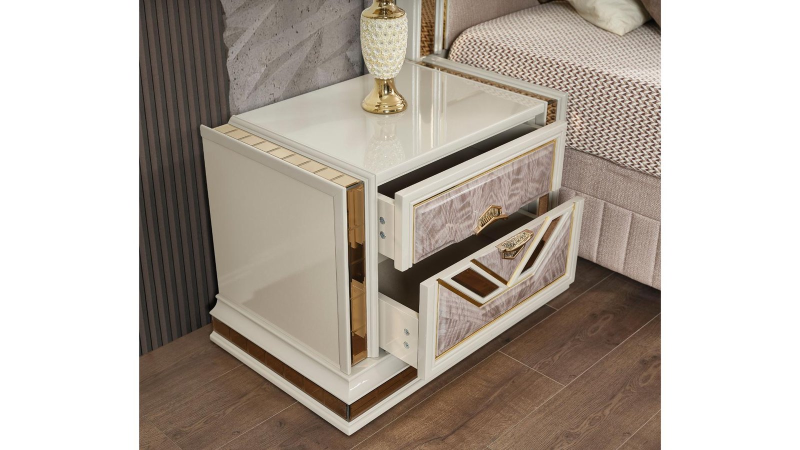 Unique patterning on the dresser, chest, and nightstand for added character.