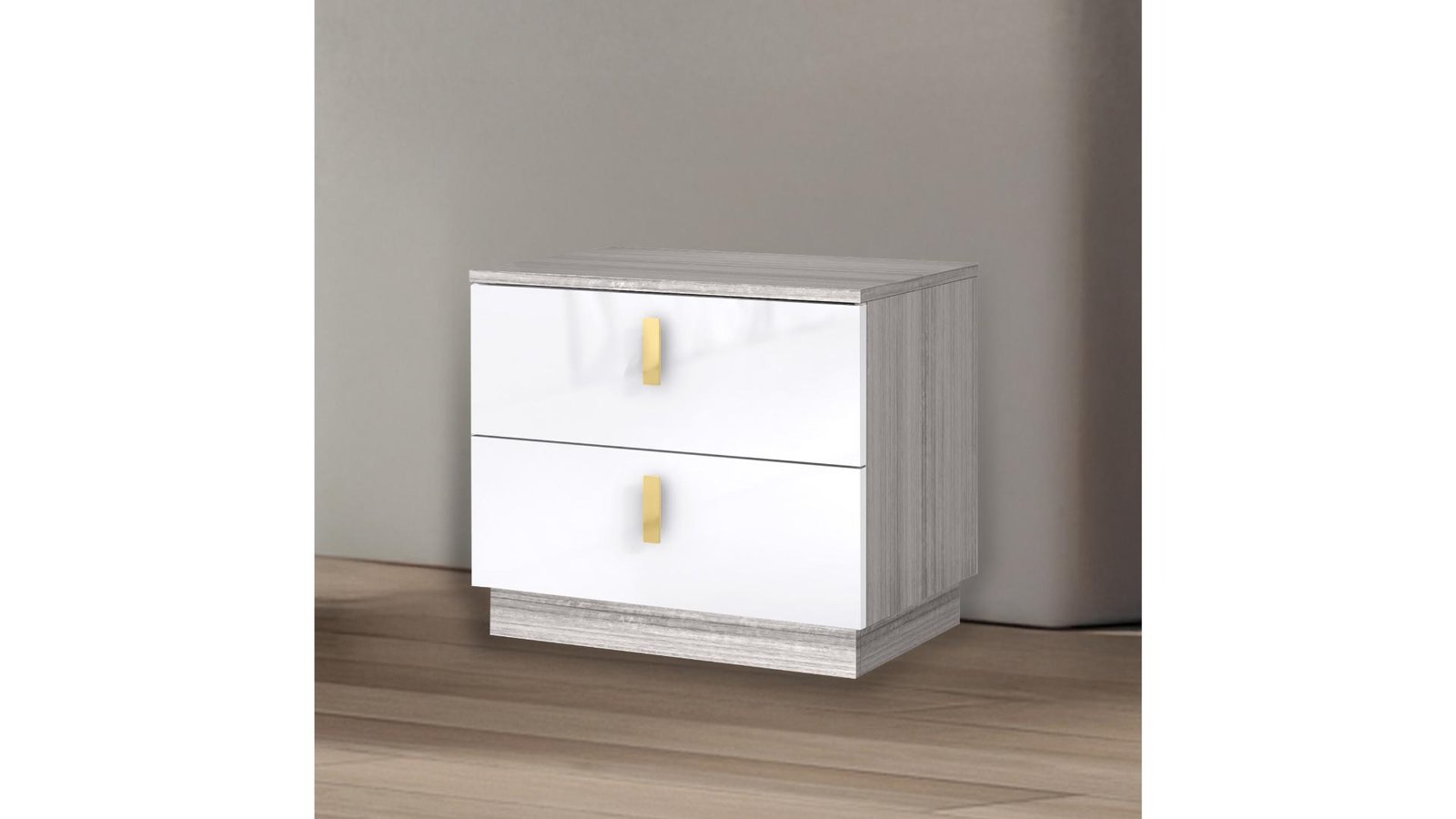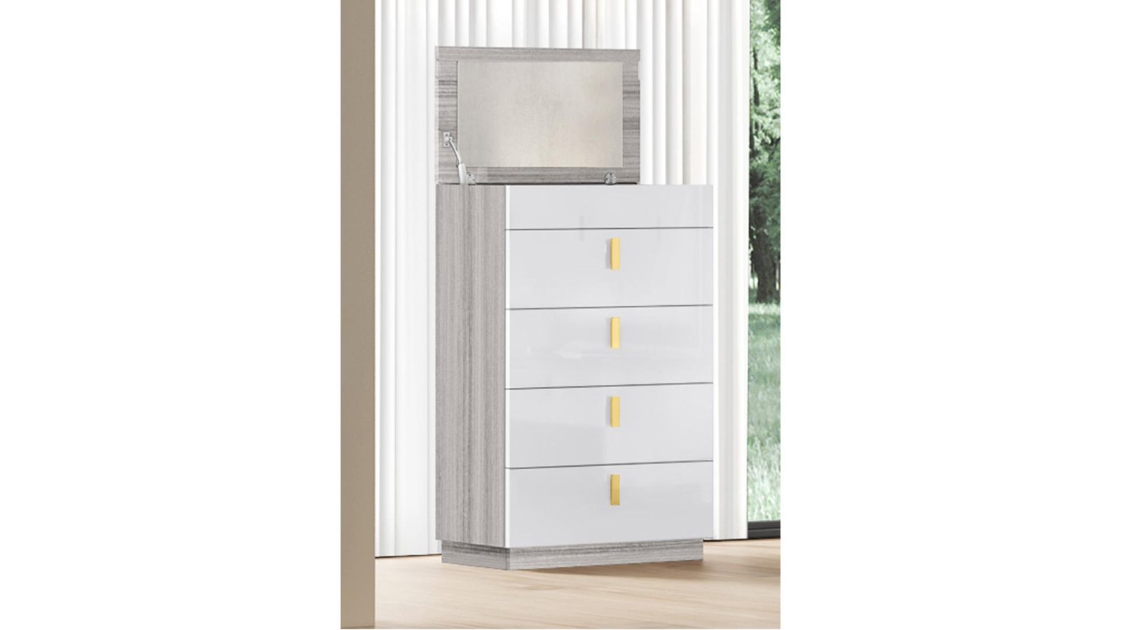 Enhance your bedroom with this modern and functional bedroom set, designed for both style and practicality. The upholstered headboard features integrated LED lighting and elegant accent details, creating a contemporary ambiance. This set includes a hydraulic lift storage bed, offering ample hidden storage space for bedding and essentials. The sleek two-tone finish with gold accents adds a touch of luxury, while the matching case goods provide additional storage with smooth-glide drawers. Crafted with high-quality materials, this set is a perfect combination of sophistication and functionality