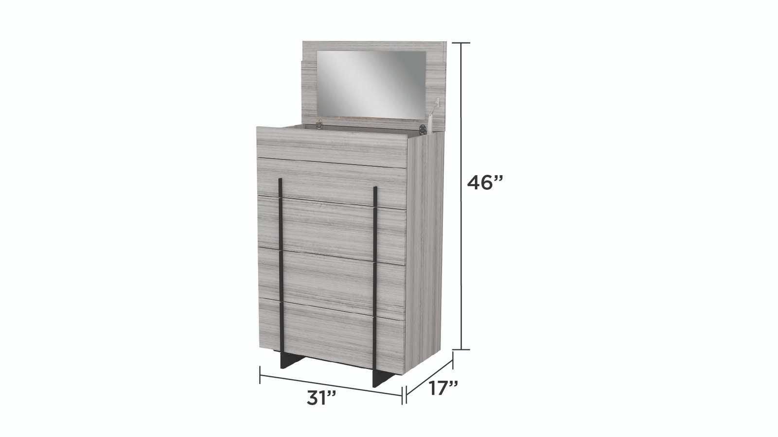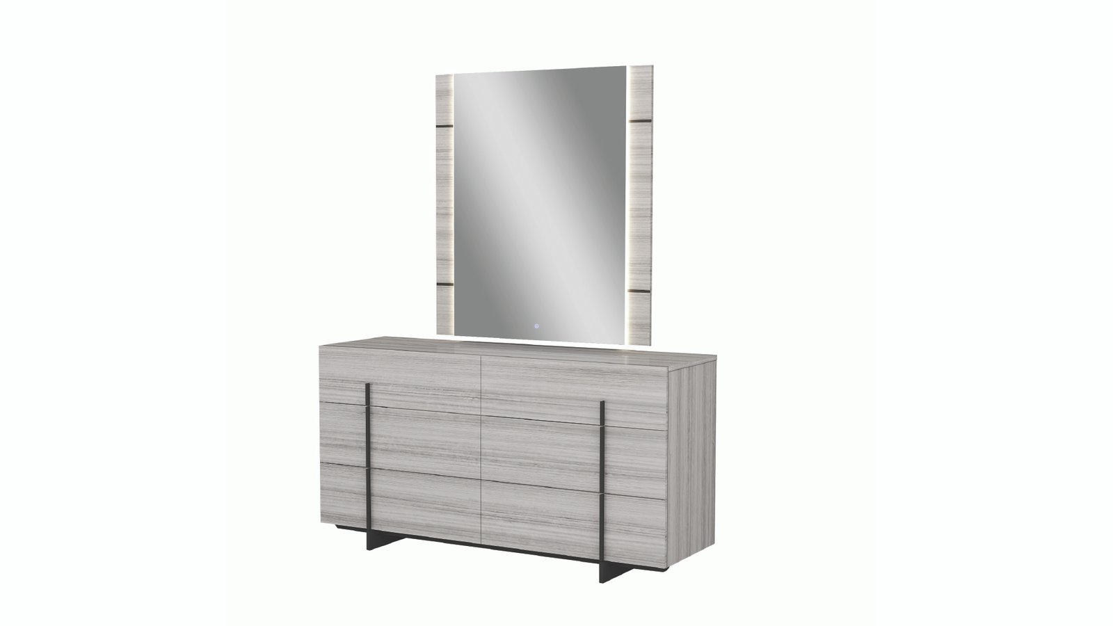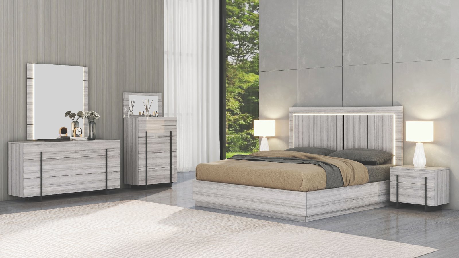 Upgrade your bedroom with this sleek and modern bedroom set, designed to offer both style and practicality. The bed features a luxurious panel headboard with built-in LED lighting, creating a soft ambient glow. Crafted from high-quality materials, this set includes a hydraulic lift-up storage bed, dresser, mirror, chest, and nightstand, providing ample space to keep your essentials organized. The sophisticated design is enhanced with a textured wood finish and metal accents, making it a perfect choice for contemporary interiors.