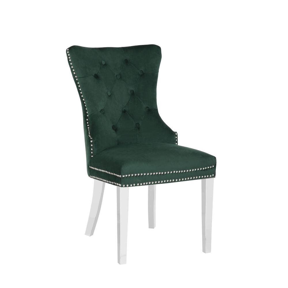 The chair is beautifully structured with smooth velvet fabric, available in Black, Dark Grey, Navy Blue and Green, adding a rich, elegant, and sophisticated touch to your living and dining spaces. Crafted to perfection, its chrome legs and chrome handle bring instant sparkle, while the unique bedazzled buttons along the perimeter enhance its luxurious appeal. Designed for both style and comfort, the cushioned seat provides exceptional relaxation, whether dining or unwinding in your living room. As a trusted source for unique furniture, including bedrooms, living rooms, dining rooms, and accent pieces, this chair is a perfect blend of elegance, durability, and comfort.