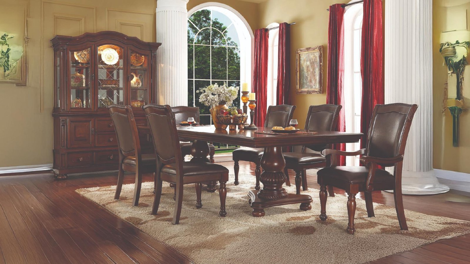 Elevate your dining space with this grand traditional dining set, designed to bring timeless elegance and sophistication. Featuring a rich brown wood finish, intricately carved details, and luxurious upholstered seating, this set blends classic design with modern comfort. The large rectangular dining table is supported by a sturdy pedestal base, while the chairs feature padded leather upholstery for an opulent dining experience. The coordinating china cabinet offers ample storage and display space with glass doors and interior lighting, making it the perfect centerpiece for formal dining rooms.