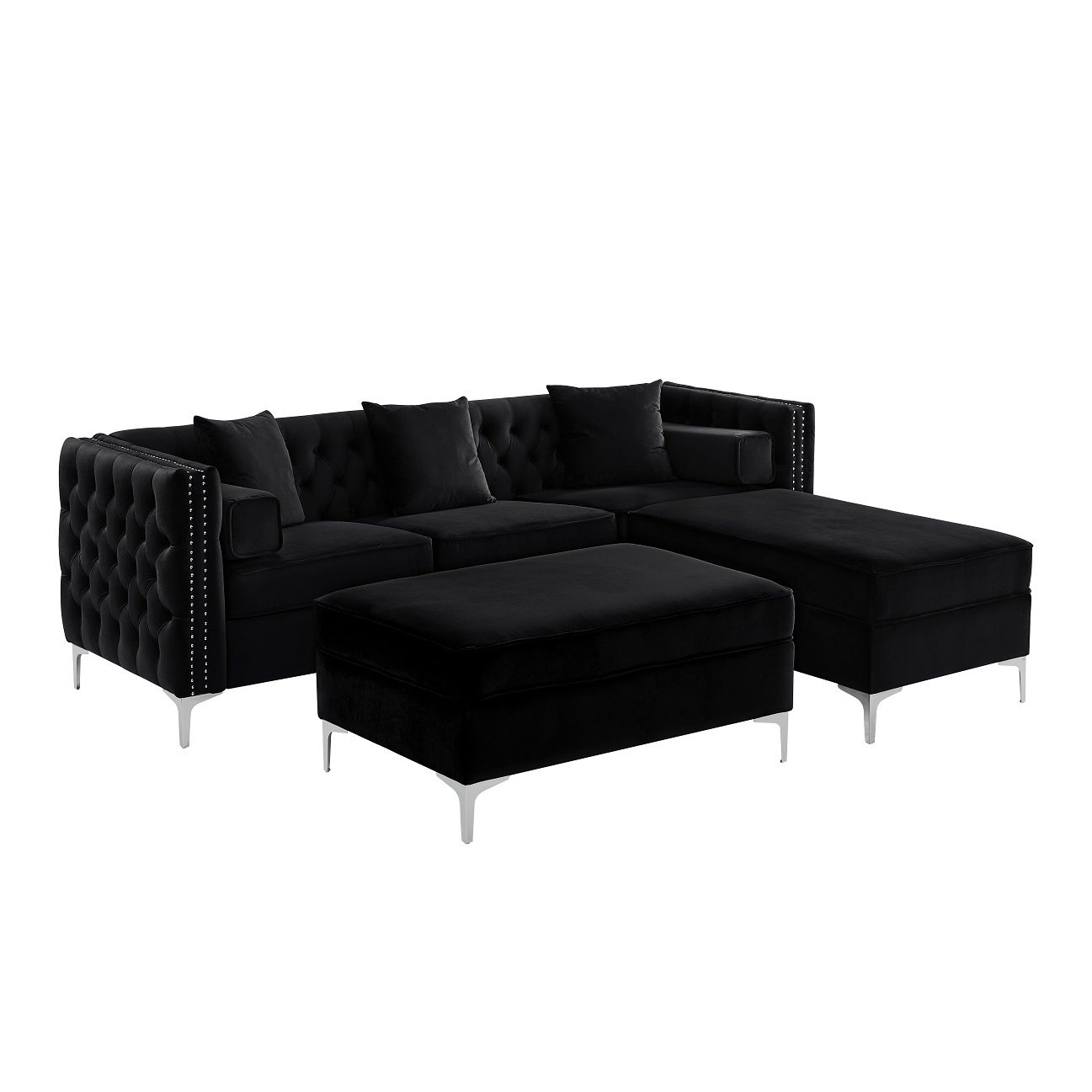 Black Velvet Reversible Sofa Sectional With Deep Tufting and nailhead Details, Chrome legs and Accent Pillows.