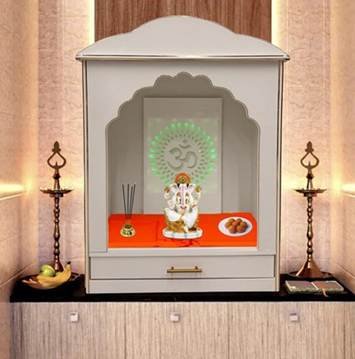 Bring tranquility to any space, large or small, with the FSK Furniture MC-103 Tabletop Mandir. This beautifully compact home temple is proudly made in Canada and is ideal for placing on a console or cabinet. It features a gracefully curved arch, a serene light grey finish, and a convenient drawer for storing incense and other small items. The design includes an elegant Om symbol with backlighting.