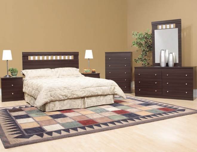 Sleek and sophisticated, the NB-88 bedroom set in Shadow Oak features modern silver accents on the headboard. This Canadian-made collection offers a chic, contemporary look for any bedroom.