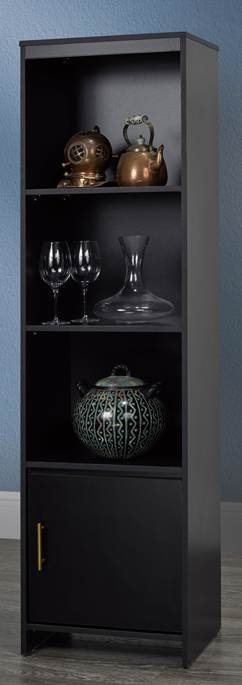 Achieve a sleek and organized look with the NE-106 bookcase. This versatile piece combines open and closed storage, with three spacious shelves for books and decor, and a bottom cabinet to hide clutter. The minimalist black design with a single gold-tone handle makes it a chic addition to a living room, office, or bedroom.