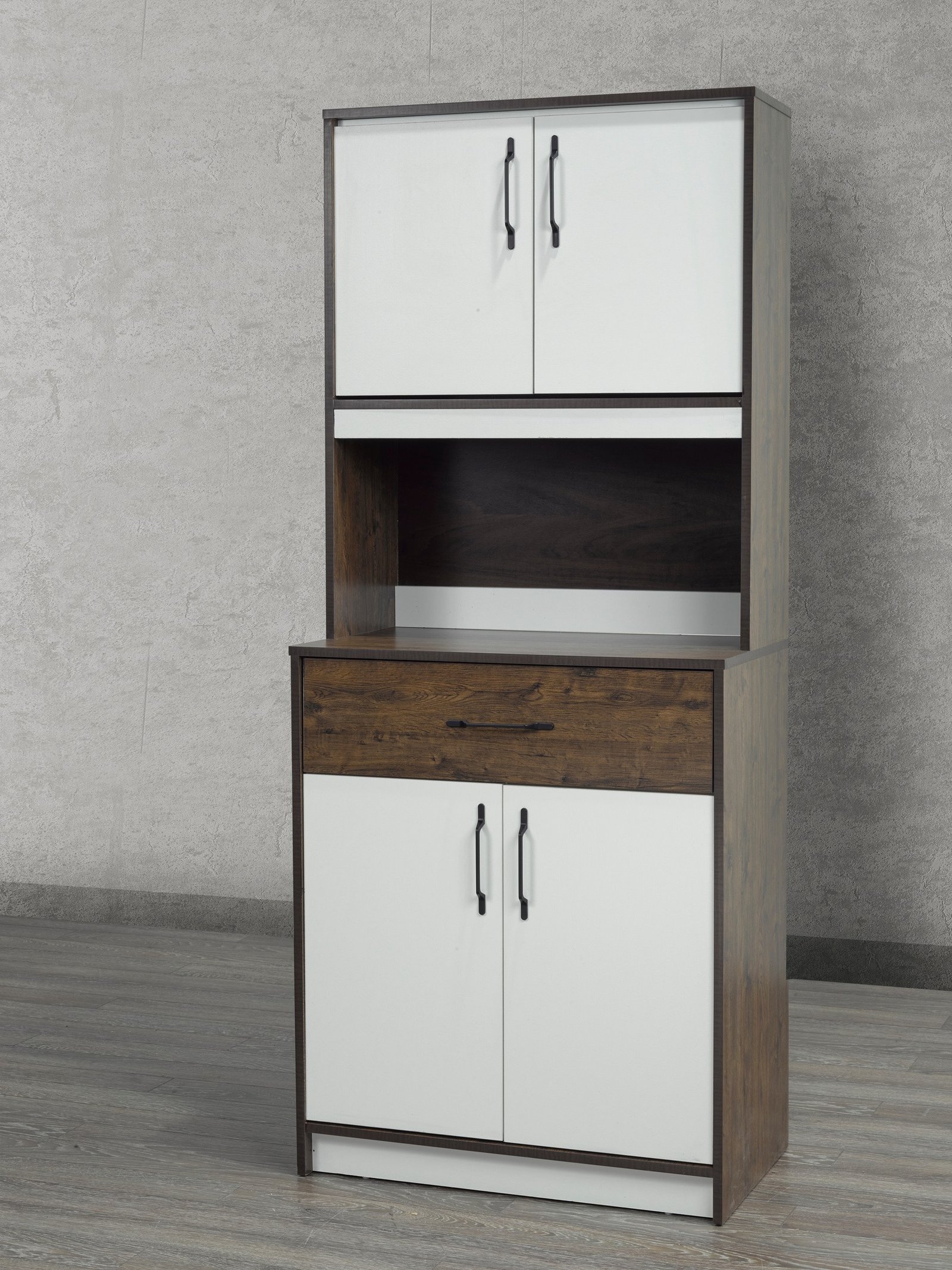 Add valuable storage and style to your kitchen or dining space with the NM-3 hutch cabinet. This functional piece offers a beautiful two-tone design, combining a dark wood grain frame with clean white doors. It features upper and lower cabinets, a storage drawer, and a central open shelf perfect for a microwave or coffee maker.
