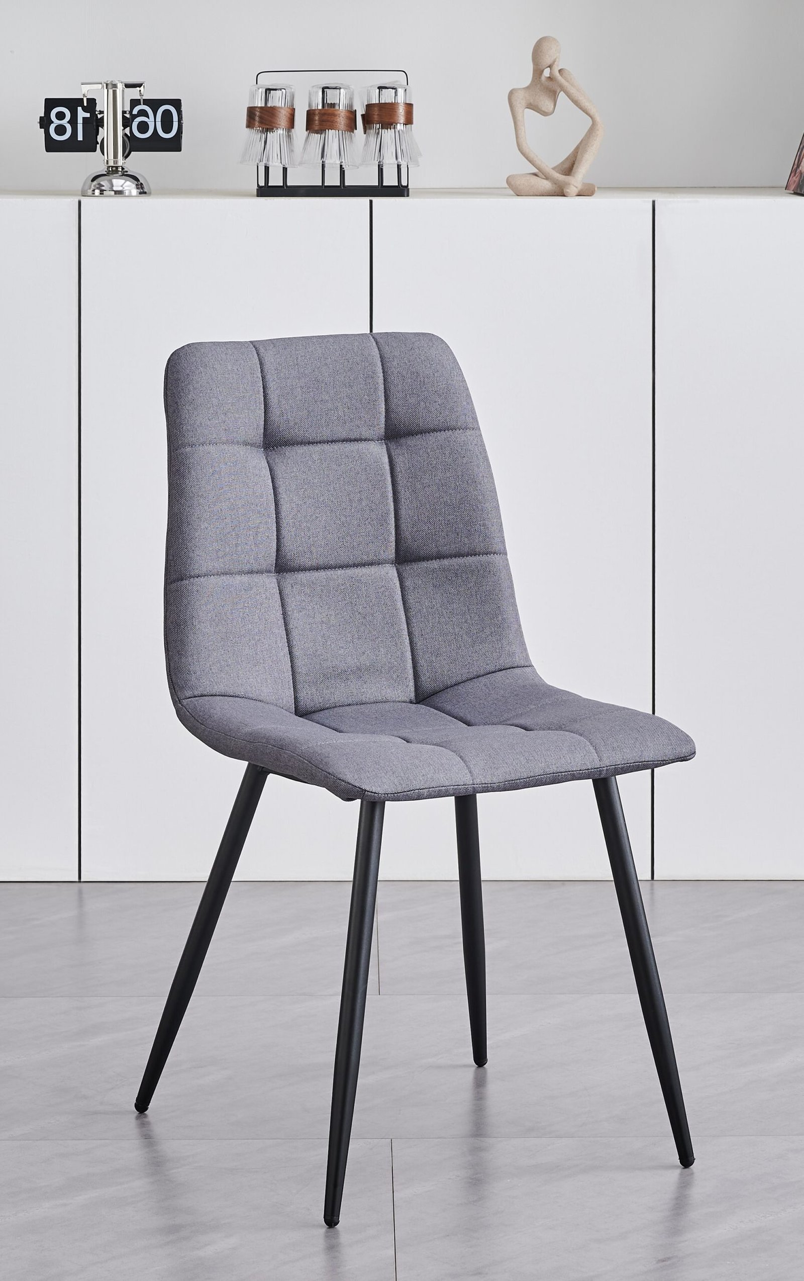Chairs: Grey Fabric with Cross Stitching Details,  Black Steel Legs